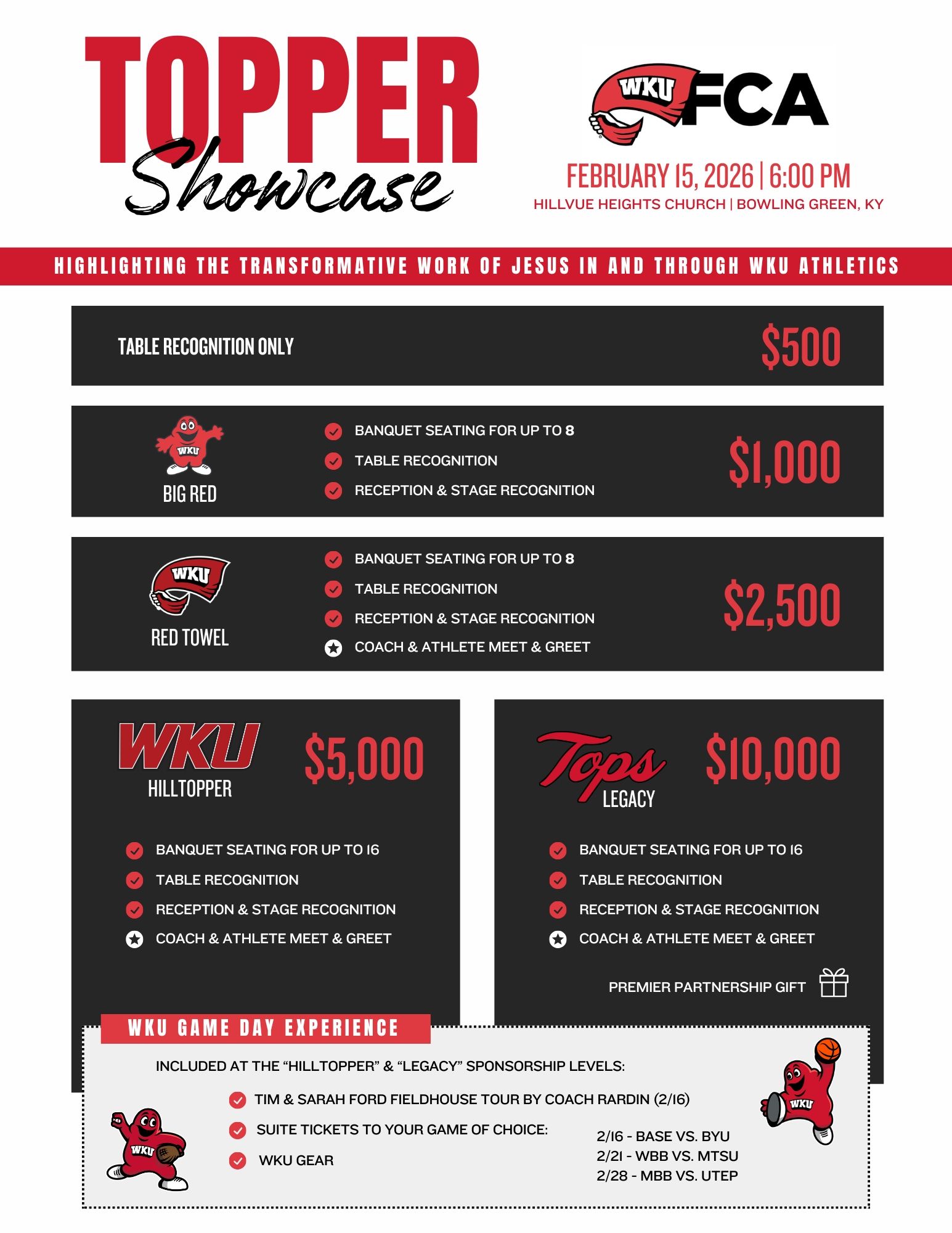So you're ready to partner with WKU FCA by financially sponsoring the Topper Showcase? Fantastic! Please review the sponsorship levels and fill out the form below so we can prepare for your visit.